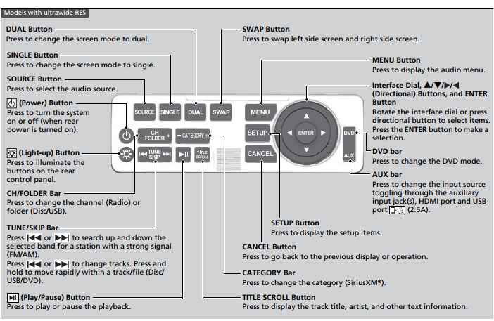 Acura MDX (2014 - 2020 ) Ultrawide Screen DVD Remote Controller