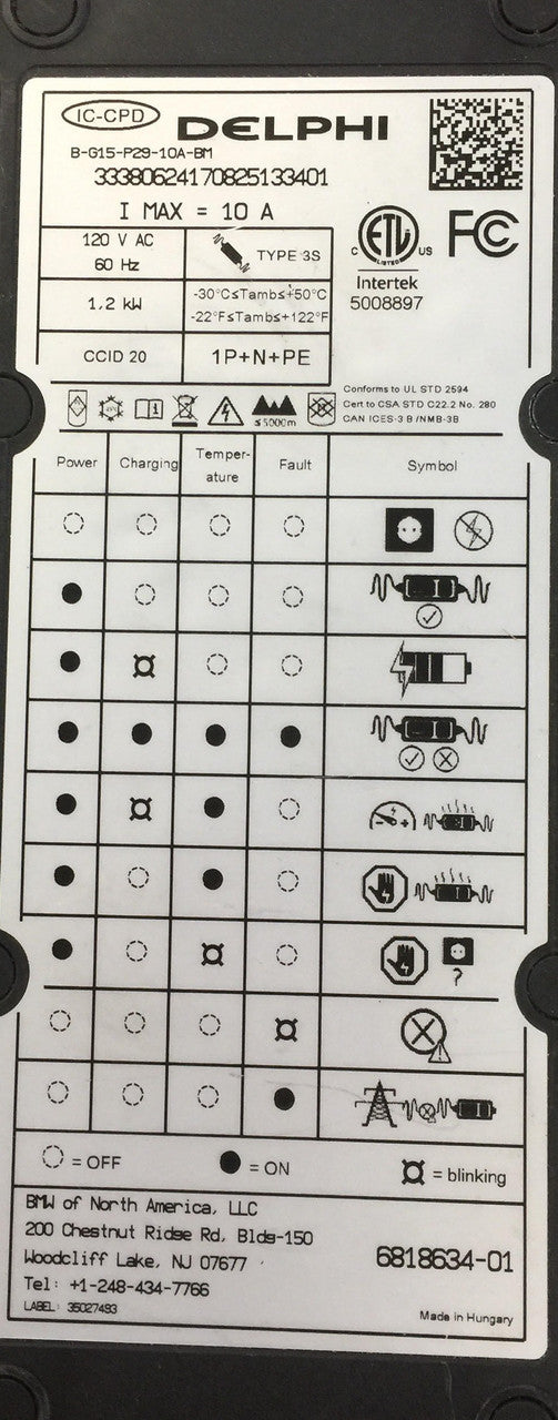 Delphi's Portable Electric Vehicle Charger is a type of portable Electric Vehicle Supply Equipment (EVSE) with cord connector that enables convenient charging of Battery Electric Vehicles (BEV) and Plug-in Hybrid Electric Vehicles (PHEV). This safe, easy-to-use, Level 1 portable charging cordset allows EV owners to charge their vehicles anywhere from an available 120VAC service. The Delphi Portable Electric Vehicle Charger is formally listed as Electric Vehicle Supply Equipment with Underwriters Laboratory Inc. (UL) and Intertek (ETL).